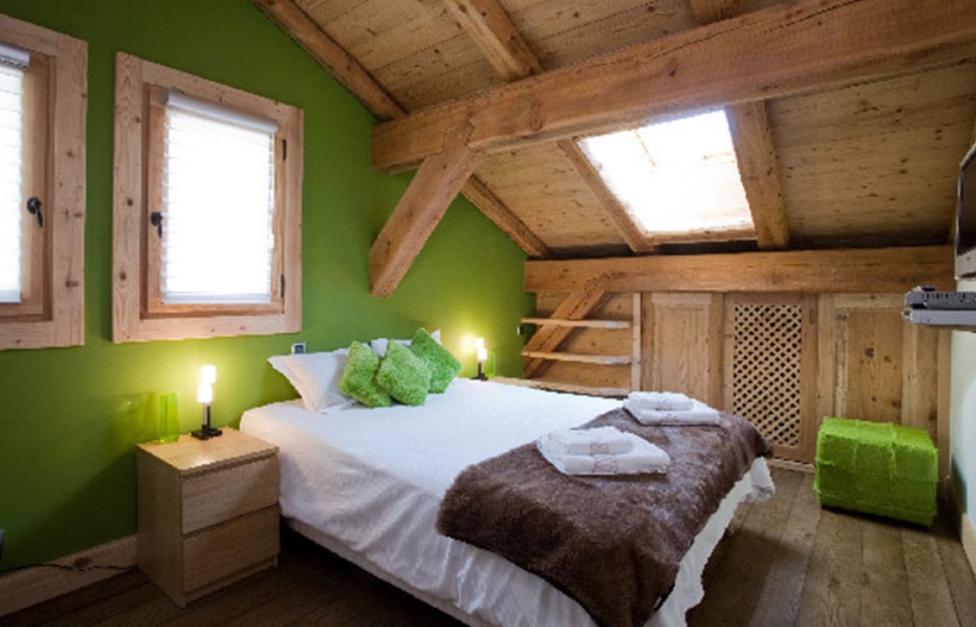 – Green bedroom with two single beds of 90 X 200 (which can be configured as a double bed) en suite with bath, basin and wc.