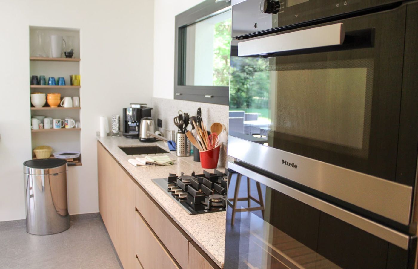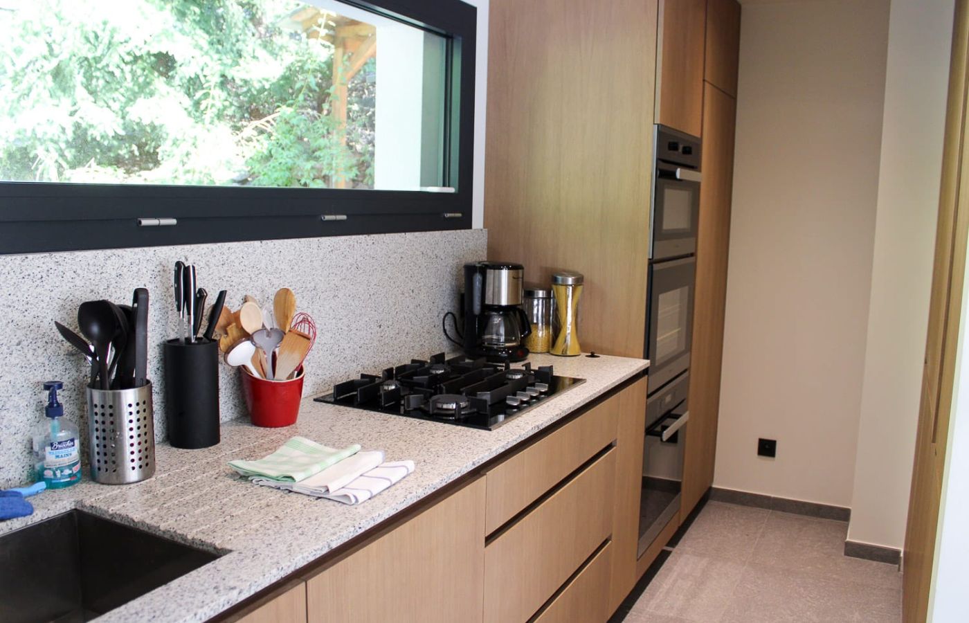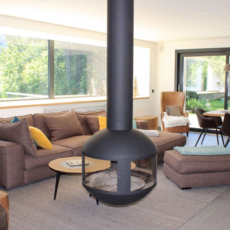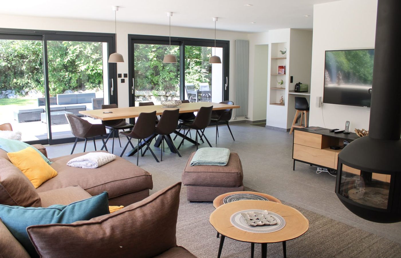 - Pièce à vivre ouverte salon avec poêle à bois, cuisine équipée et salle à manger avec accès de plein pied sur la terrasse et le jardin