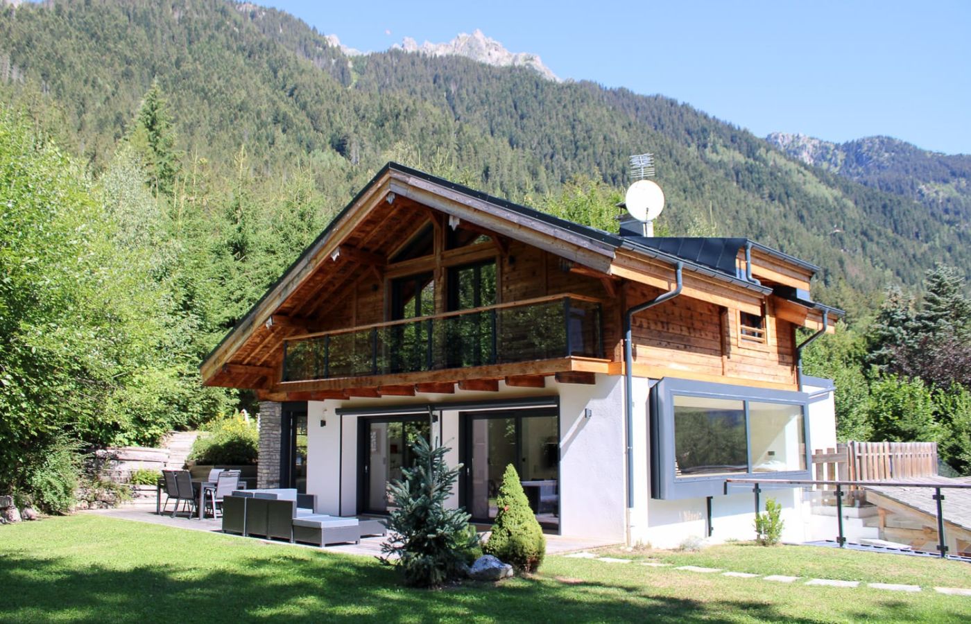 Ce charmant chalet élégant de quatre chambres est situé à mi-chemin entre le centre ville de Chamonix et le téléphérique de La Flégère, légèrement surélevé du fond de la vallée, baigné de soleil et situé dans un magnifique jardin arboré, il offre une vue imprenable sur la vallée.