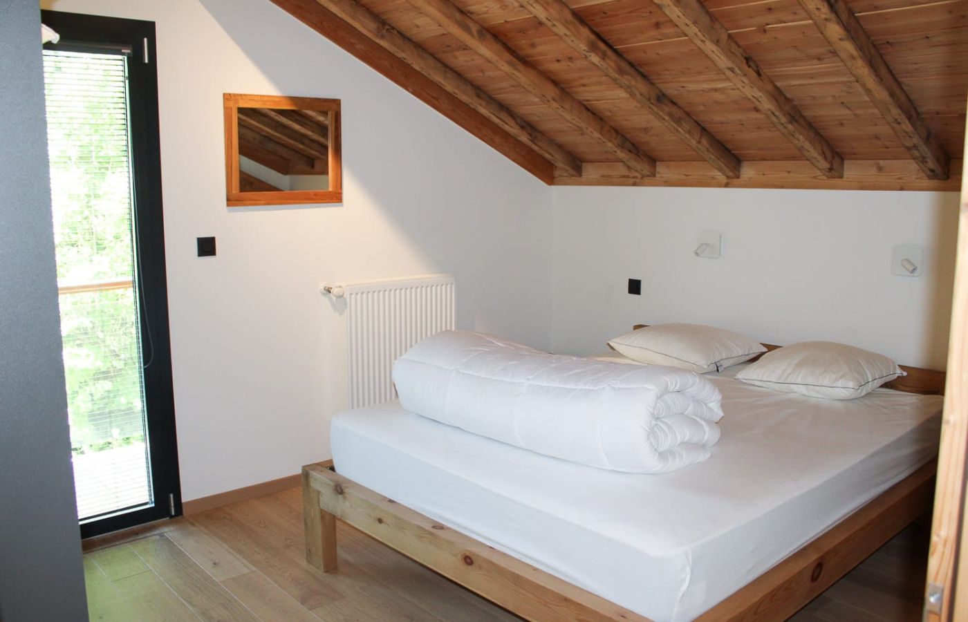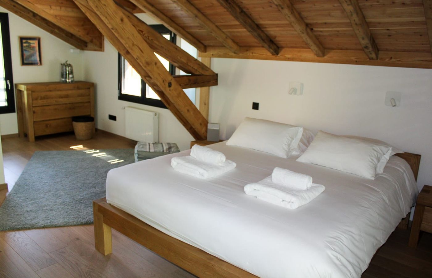 Les 2 chambres principales avec salle de bains en suite sont au dernier étage avec chacune un balcon privé et encore une fois une superbe vue. Il y a deux autres chambres au rez-de-chaussée partageant une salle de bain, un grand garage et local à ski pour compléter.