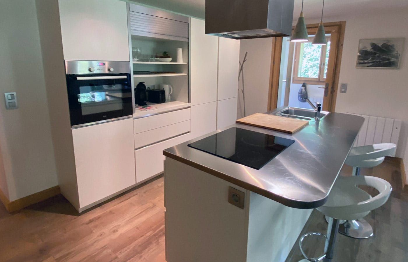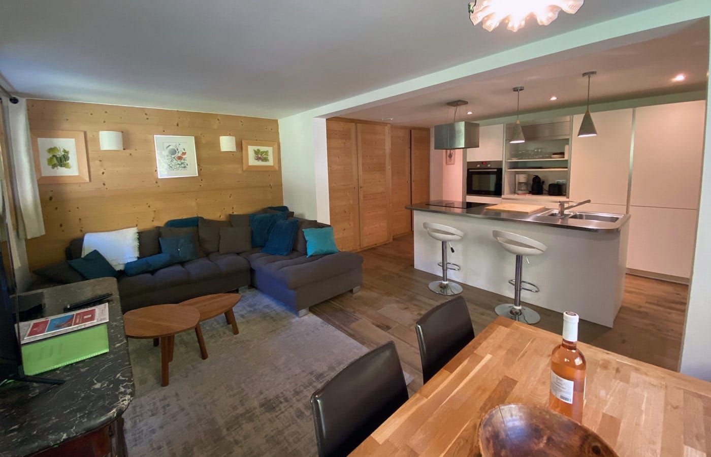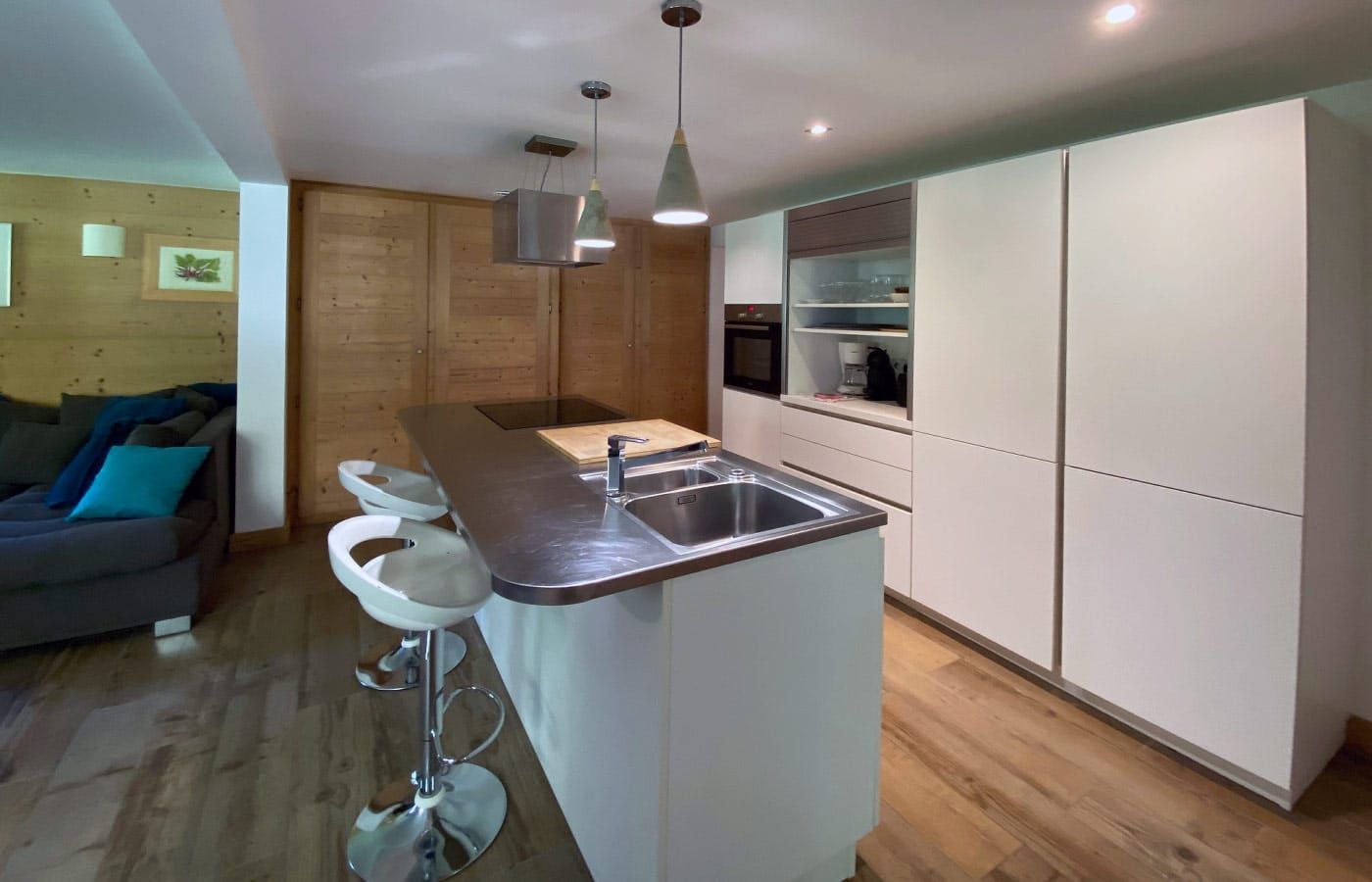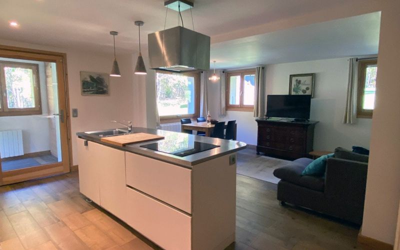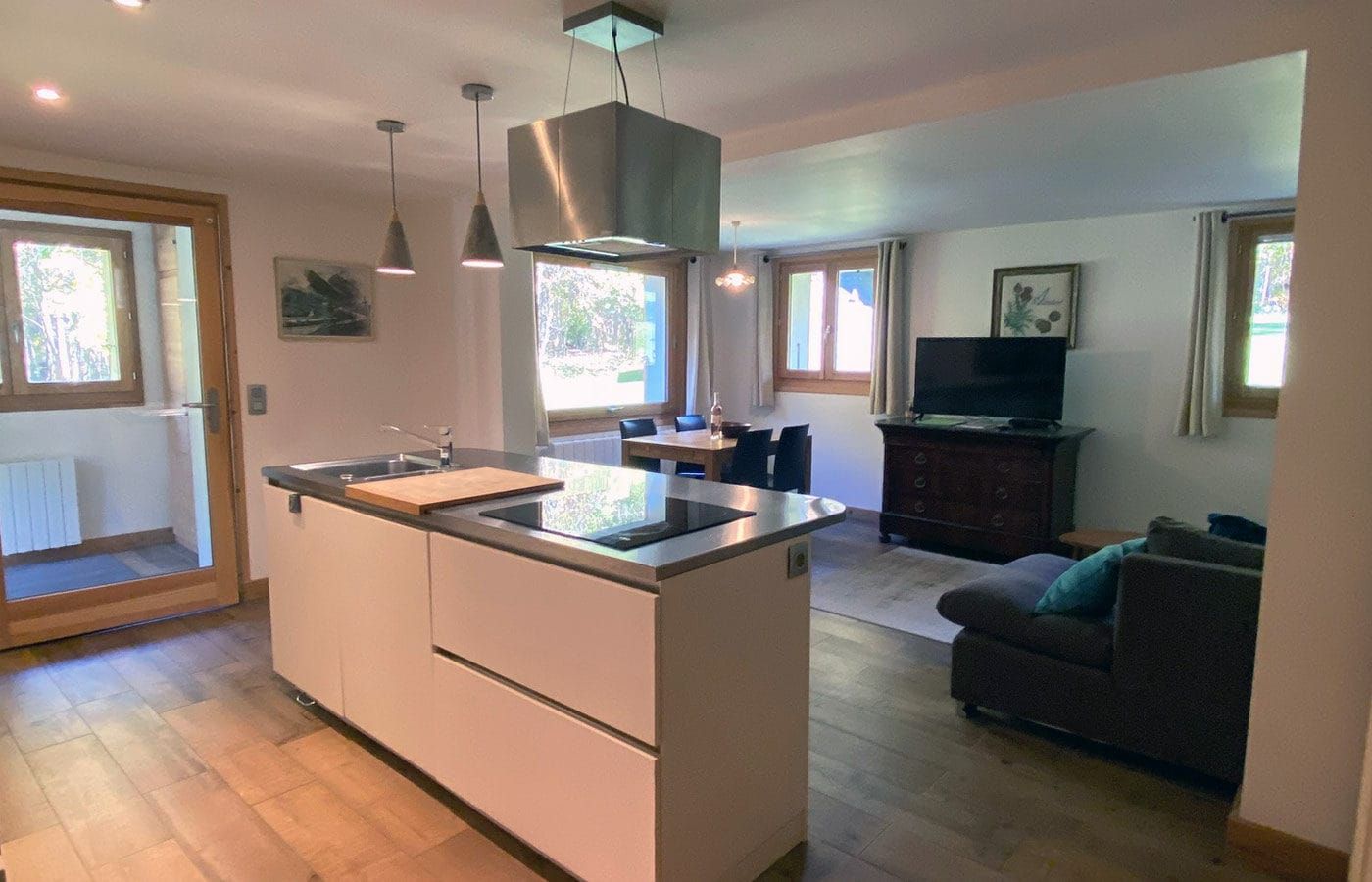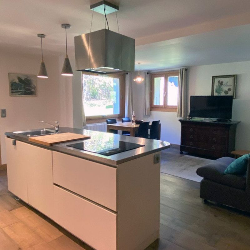 Cuisine moderne équipée avec îlot central, très sympa pour partager un verre ou le petit-déjeuner, ouverte sur l’espace repas et le salon avec canapé d’angle et TV.