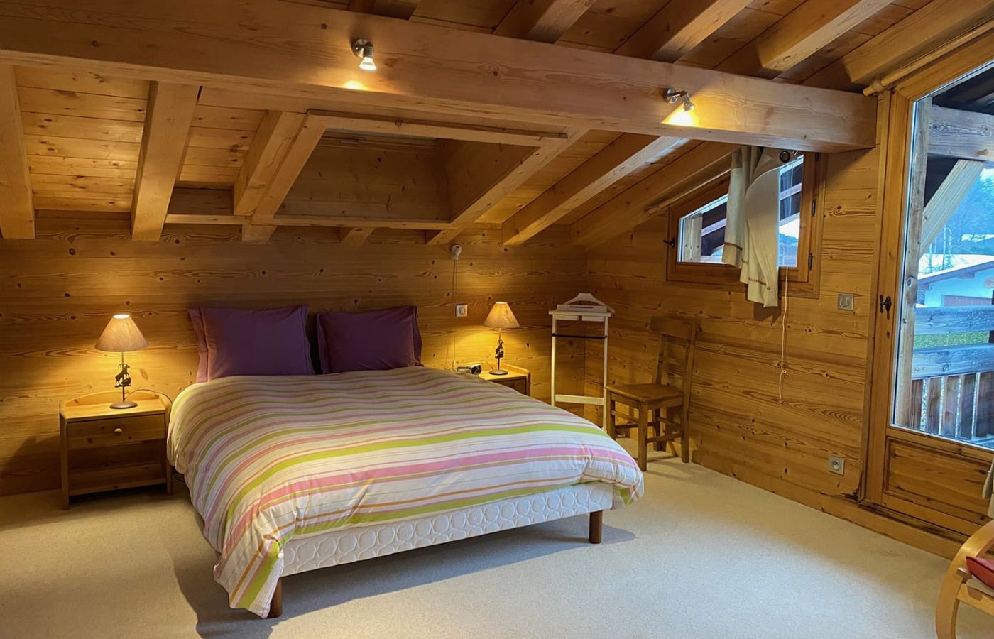 Au premier sous la belle charpente se situe l’espace nuit pour 6 personnes, avec des découpes de poutres nous faisant penser au refuge de montagne :