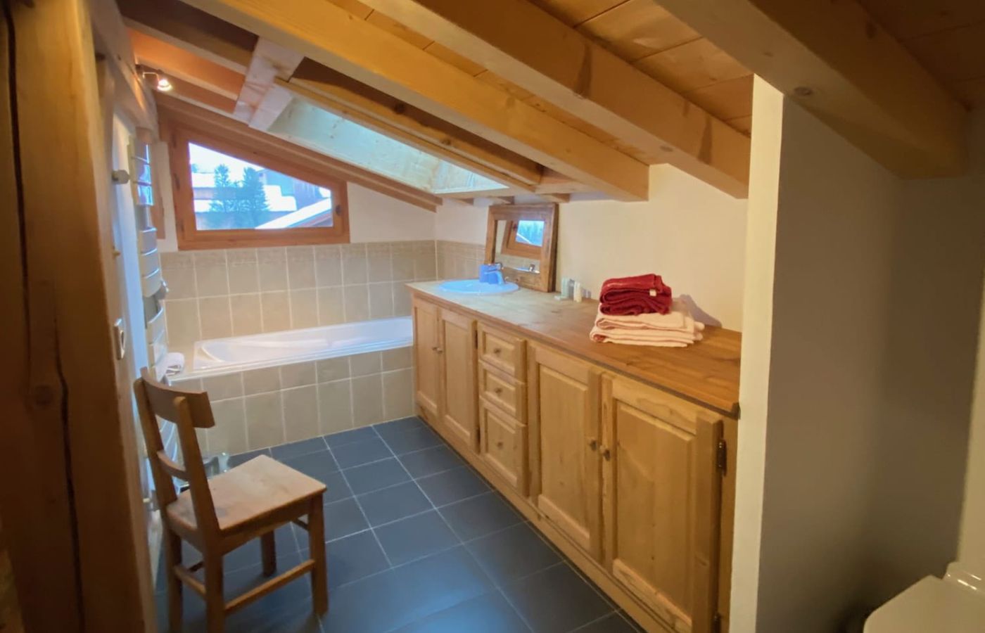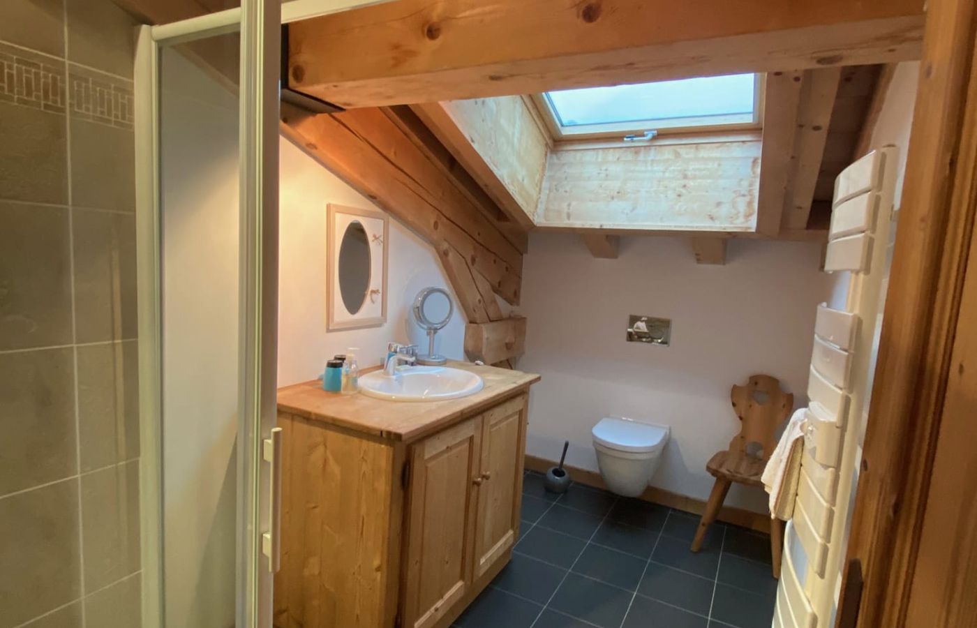 – 1 chambre parentale, exposition sud, vue sur la chaîne du Mont-Blanc, avec balcon, en suite avec bain, WC, et douche.