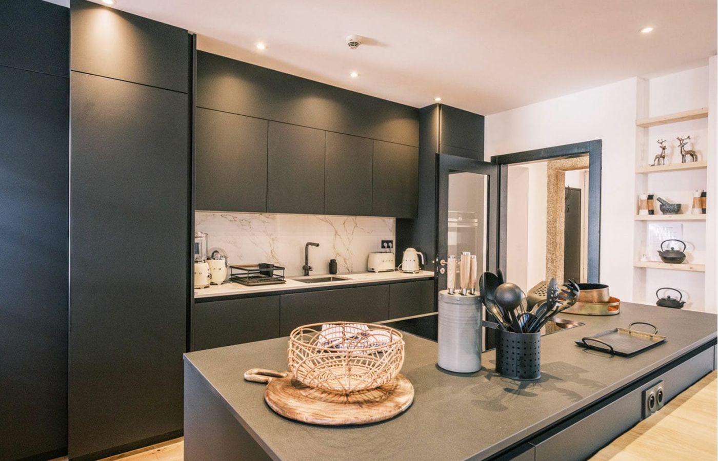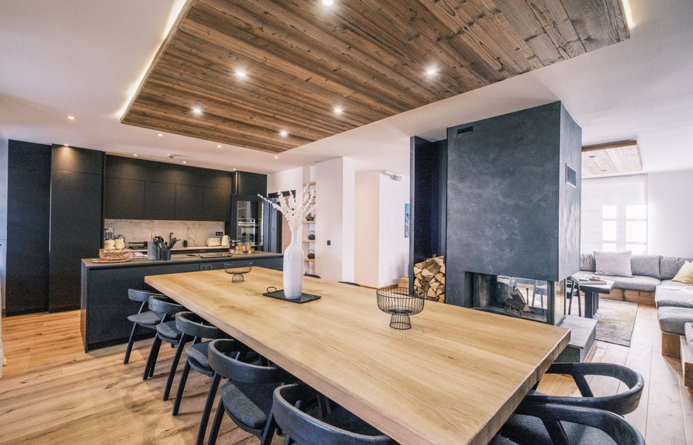 Cuisine entièrement équipée avec espace repas attenant, cheminée centrale, grand espace canapé