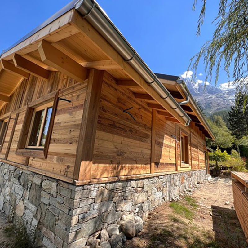 Bardage en vieux bois, pierre sèche en sous-bassement.
